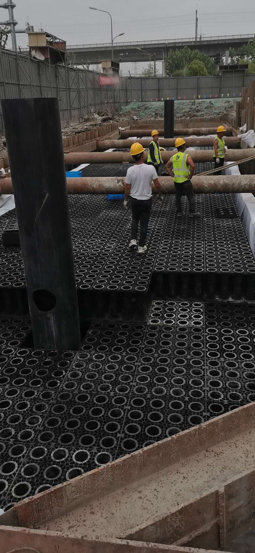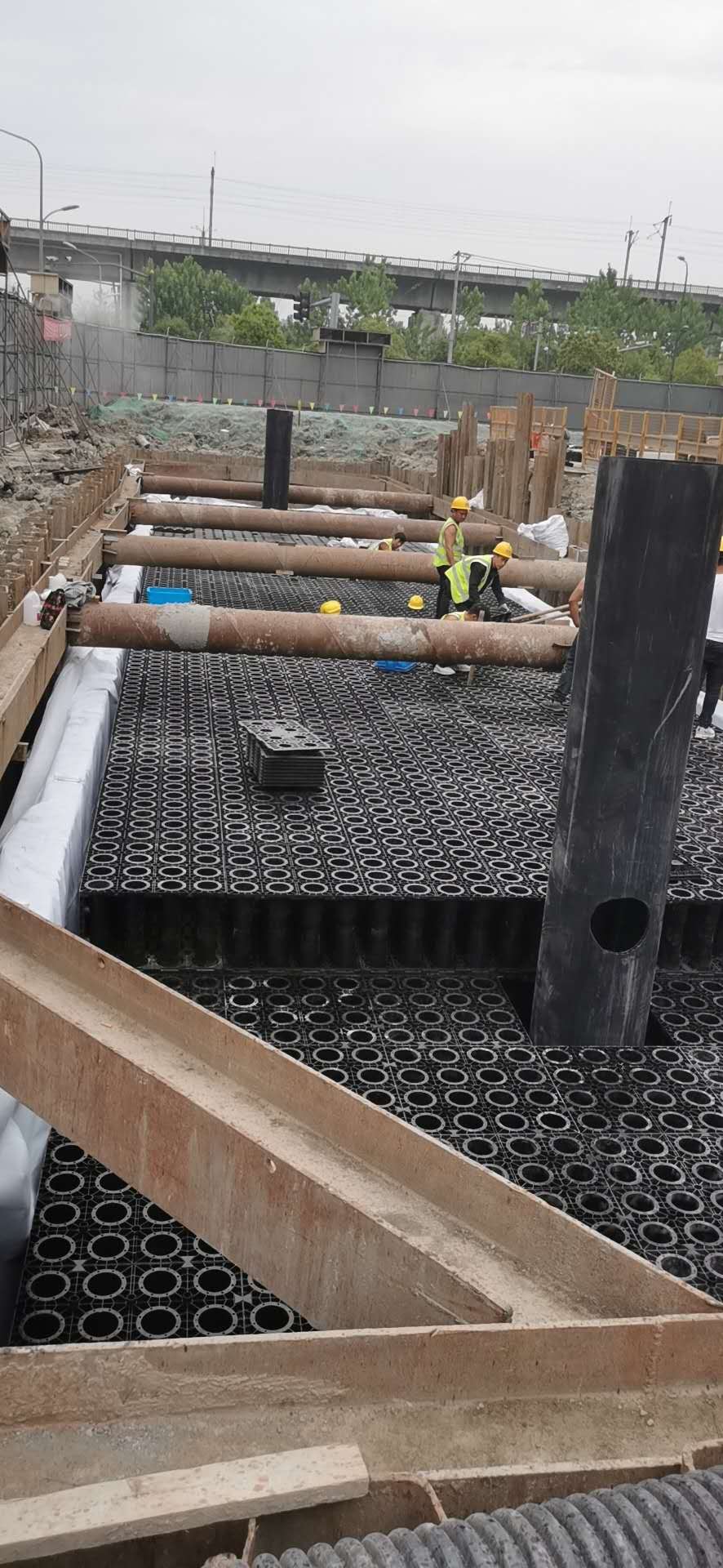 3、因電力部門要求,1號展廳東側200立方雨水回用模塊與110KV高壓電纜距離7米左右,高壓電纜15米范圍內(nèi)禁止開挖,現(xiàn)將1.2號展廳兩個雨水模塊合并成一個400立方設置在1號展廳西側。