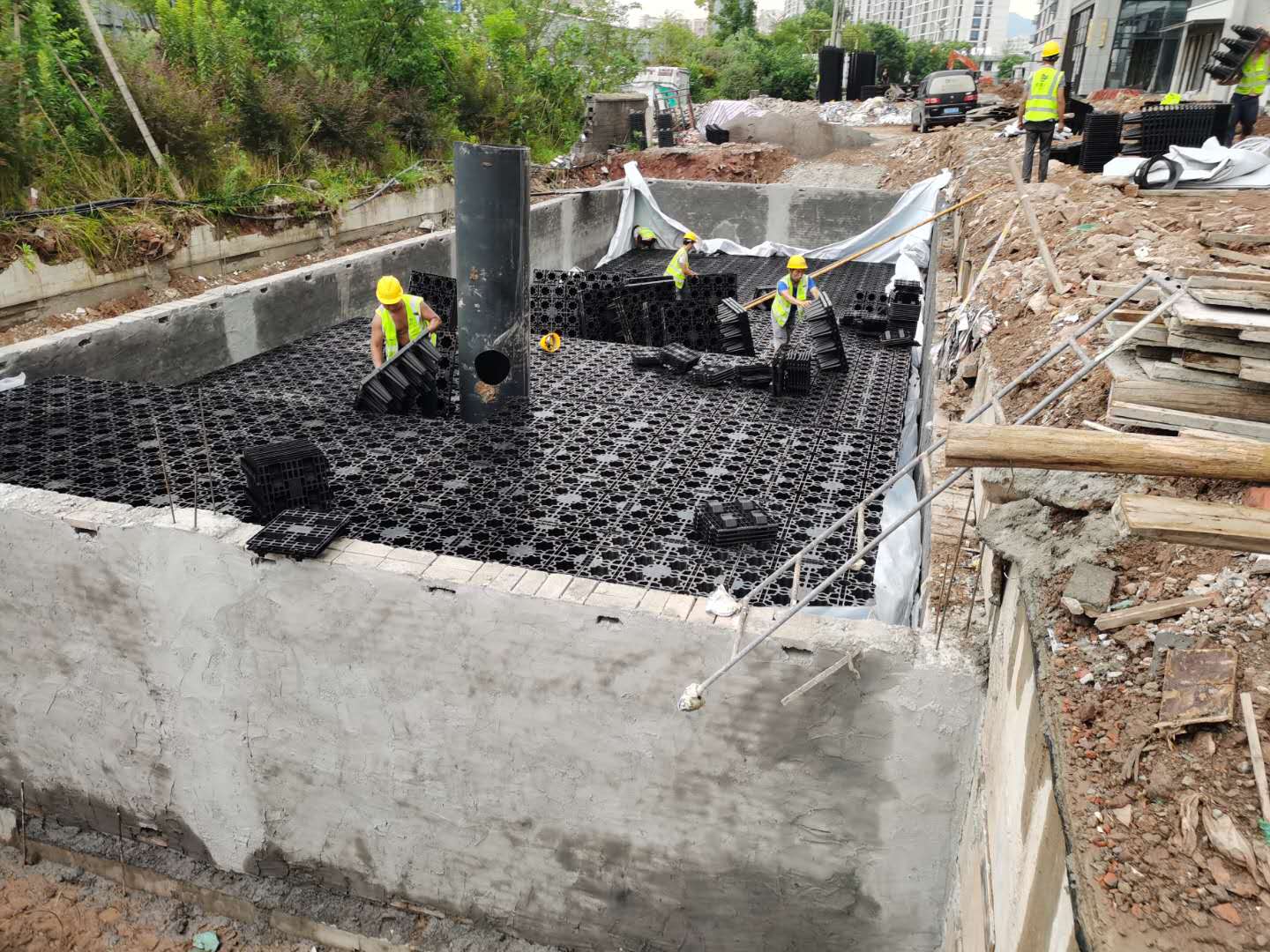 該項(xiàng)目雨水回收系統(tǒng)采用地埋PP模塊組合水池的方式收集雨水,前期經(jīng)過(guò)截污掛籃、棄流過(guò)濾,后期通過(guò)地埋一體機(jī)過(guò)濾,消毒,最終使水質(zhì)達(dá)到規(guī)范標(biāo)準(zhǔn),用于廠區(qū)綠地的澆灑,景觀補(bǔ)水,道路沖洗。