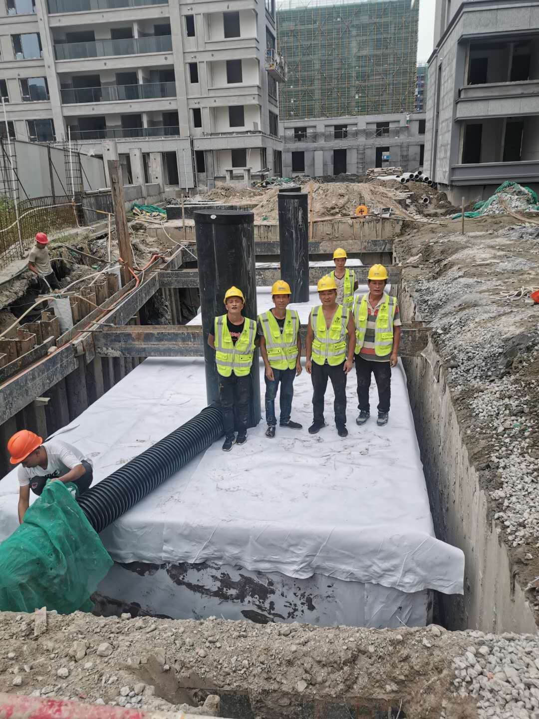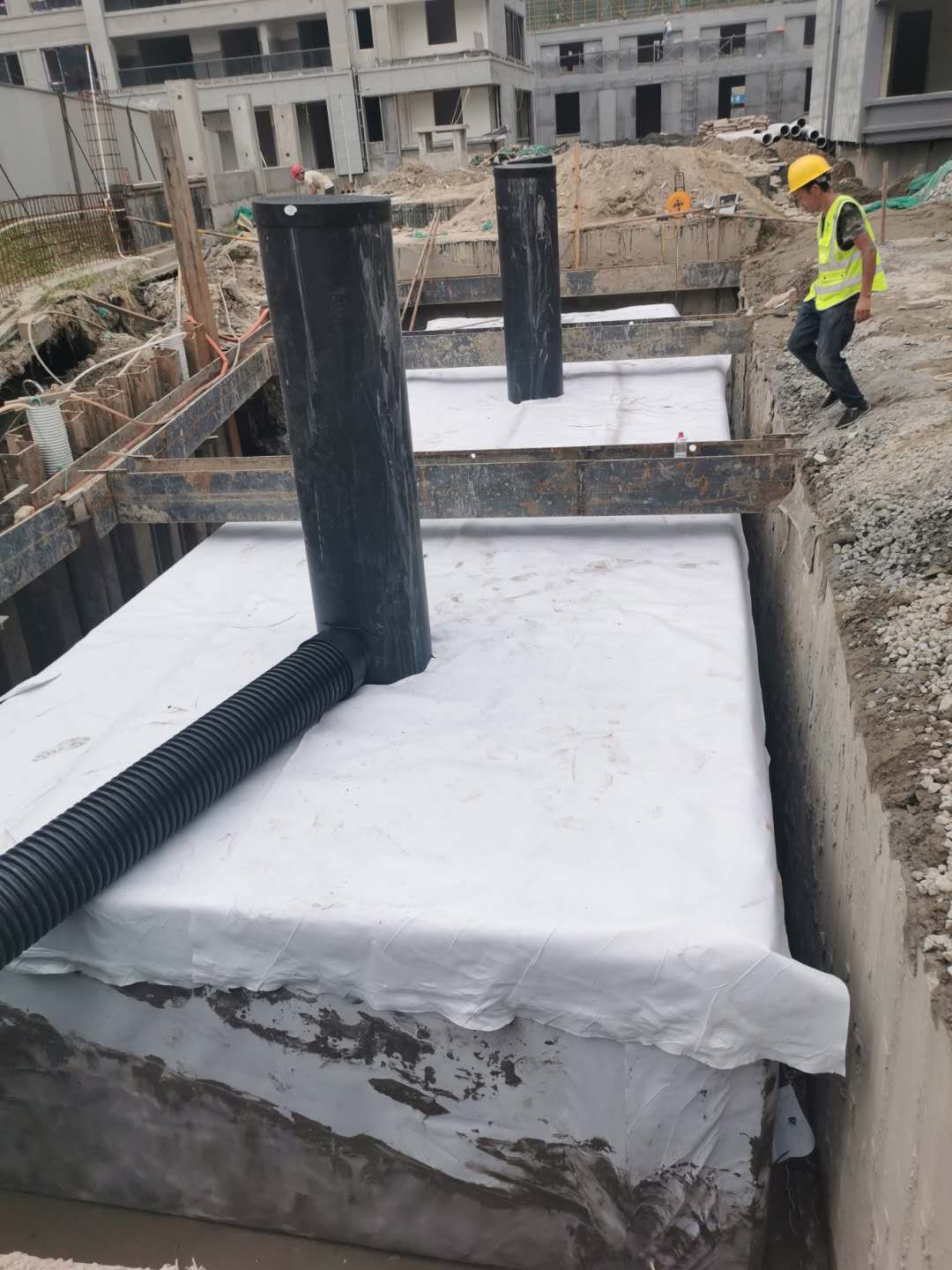 該項目雨水回收系統采用地埋PP模塊組合水池的方式收集雨水,前期經過截污掛籃、棄流過濾,后期通過地埋一體機過濾,消毒,最終使水質達到規范標準,用于廠區綠地的澆灑,景觀補水,道路沖洗。